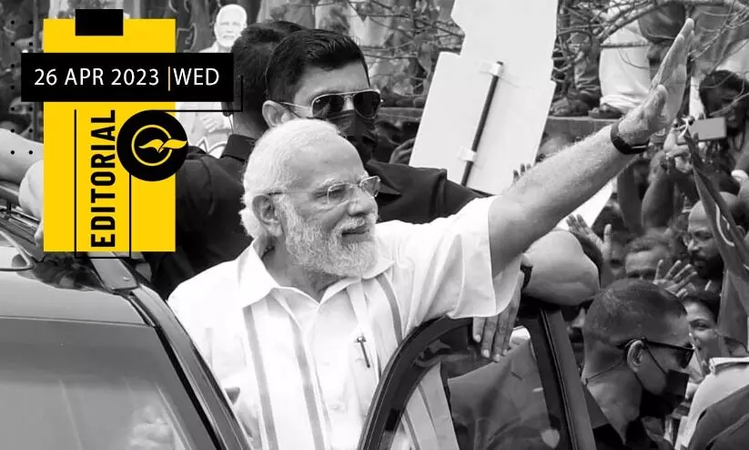 text_fieldsഏപ്രിൽ 24, 25 തീയതികളിലായി പ്രധാനമന്ത്രി നരേന്ദ്ര മോദി നടത്തിയ കേരള സന്ദർശനവും പങ്കെടുത്ത പരിപാടികളും ശ്രദ്ധിച്ചാൽ പ്രഥമദൃഷ്ട്യാ വ്യക്തമാവുന്ന വസ്തുത 2024 ആദ്യത്തിൽ രാജ്യത്ത് നടക്കാനിരിക്കുന്ന പൊതുതെരഞ്ഞെടുപ്പ് ലാക്കാക്കിയുള്ള പ്രചാരണത്തിന് തുടക്കം കുറിക്കുകയായിരുന്നു മുഖ്യലക്ഷ്യം എന്നുള്ളതാണ്. ചില ദേശീയ മാധ്യമങ്ങൾ മോദിയുടെ പര്യടനത്തിന് നൽകിയ തലക്കെട്ടുതന്നെ അത് സൂചിപ്പിക്കുന്നു. അഭൂതപൂർവമായ സുരക്ഷ സന്നാഹങ്ങളോടെ തികച്ചും ആസൂത്രിതമായി തയാറാക്കിയ പരിപാടിയിലെ മുഖ്യ ഇനങ്ങളിലൊന്ന് യുവം എന്നുപേരിട്ട യുവമോർച്ച പ്രവർത്തകരുടെയും ബി.ജെ.പിയോടൊപ്പം നിൽക്കുന്ന യുവാക്കളുടെയും സംഗമമായിരുന്നു.