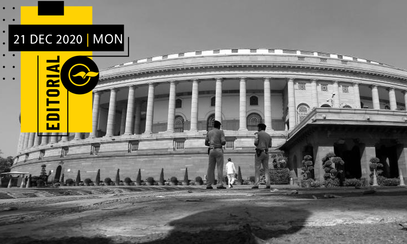 രണ്ടും എട്ടു ദിവസം വീതം വെട്ടിച്ചുരുക്കിയെന്നു മാത്രം. അന്നേ സർക്കാറിന് അതിലെ സൗകര്യം ബോധ്യപ്പെട്ടുകാണണം. മൺസൂൺ സമ്മേളനത്തിൽ 25 ബില്ലാണ് പാസാക്കിയെടുത്തത്; അതിൽ 15 എണ്ണം രാജ്യസഭയിലായിരുന്നു; അതിൽതന്നെ ഏഴെണ്ണം നാലു മണിക്കൂറുകൊണ്ട് ചുട്ടെടുക്കുകയായിരുന്നു. വോട്ടെടുപ്പ് വേണമെന്ന പ്രതിപക്ഷത്തിെൻറ ന്യായമായ ആവശ്യം ചട്ടവിരുദ്ധമായി തള്ളി കാർഷിക ബില്ലുകൾ 'പാസാക്കി'യത് കോവിഡ് നൽകിയ മഹാസൗകര്യം കൂടി ഉപയോഗിച്ചാണ്. തലസ്ഥാനത്ത് കോവിഡ്ബാധ നവംബർ 16നുശേഷം ഗണ്യമായി കുറഞ്ഞതായി കണക്കുകൾ പറയുേമ്പാൾ മന്ത്രിയുടെ മറുവാദം, തണുപ്പുകാലത്ത് അത് വർധിക്കാനുള്ള സാധ്യത ഉണ്ടെന്നത്രെ.