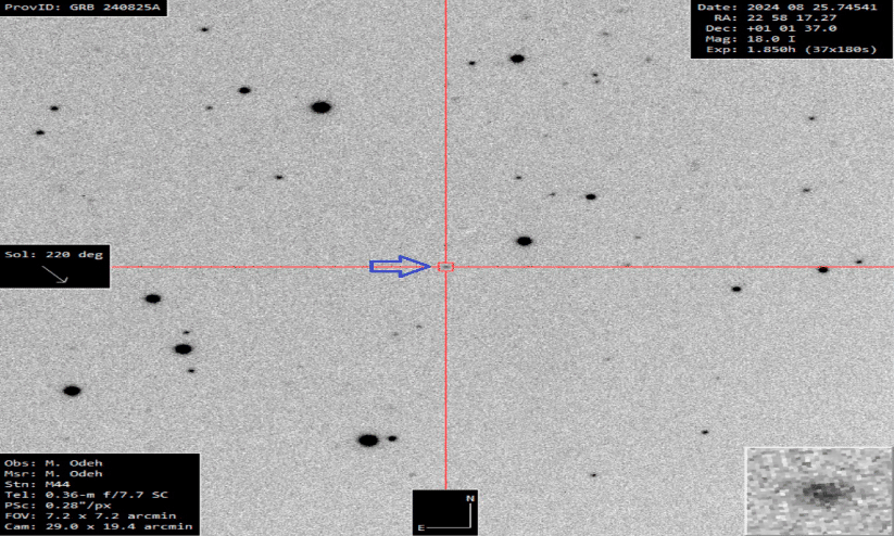 ആഗസ്റ്റ് 25ന് രാത്രി നാസയുടെ സ്വിഫ്റ്റ്, ഫെർമി ഗാമ റേ ടെലിസ്കോപ്സാണ് ഈ അപൂർവവും അതിശക്തവുമായ നക്ഷത്ര വിസ്ഫോടന പ്രതിഭാസങ്ങൾ നിരീക്ഷിച്ചത്. തുടർന്ന് രാത്രി 8.48ന് യു.എ.ഇ ബഹിരാകാശ നിരീക്ഷണ കേന്ദ്രത്തിന് മുന്നറിയിപ്പ് നൽകുകയായിരുന്നു. ഉടനെ ലക്ഷ്യസ്ഥാനത്തേക്ക് ടെലിസ്കോപ്പിന്റെ ദിശ മാറ്റുകയും വിസ്ഫോടന ദൃശ്യങ്ങളുടെ അനന്തര ഫലങ്ങൾ കാമറയിൽ പതിയുകയുമായിരുന്നു.