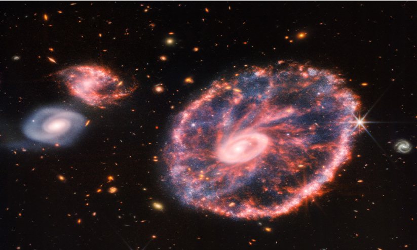 കാളവണ്ടിച്ചക്രത്തിന്റെ ആകൃതിയിലായതിനാലാണ് ഗാലക്സിക്ക് കാർട്ട് വീൽ എന്ന പേര് ലഭിച്ചത്. കുളത്തിലേക്ക് കല്ലെറിയുമ്പോൾ ഉണ്ടാകുന്ന അലകൾക്ക് സമാനമായ ഘടനയാണ് ഗാലക്സിക്കുള്ളത്. യൂറോപ്യൻ ബഹിരാകാശ ഏജൻസിയാണ് ചിത്രം പങ്കുവെച്ചത്. നക്ഷത്രരൂപവത്കരണത്തെക്കുറിച്ചും ഗാലക്സിയുടെ കേന്ദ്രഭാഗത്തുള്ള തമോഗർത്തത്തെക്കുറിച്ചും നിർണായക വിവരങ്ങളിലേക്കും ജെയിംസ് വെബ് വെളിച്ചംവീശുന്നുണ്ട്.