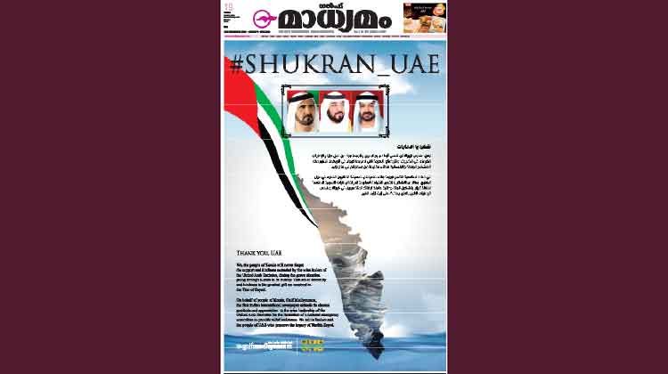 വിമാന വിലക്ക് വീണതോടെ നാട്ടിലേക്ക് തിരിക്കാൻ വഴിയില്ലാതെനിന്നവരോട് 'നിങ്ങൾ ഇവിടെ സമാധാനമായി തുടരൂ' എന്ന് പറഞ്ഞ് സൗജന്യമായി വിസ കാലാവധി നീട്ടി നൽകിയത് യു.എ.ഇയാണ്. വിസയിൽനിന്നും പിഴയിൽ നിന്നും കിട്ടാവുന്ന വൻ തുക വേണ്ടെന്നുവെച്ചാണ് മനുഷ്യത്വം മാത്രം മുൻനിർത്തി കാലാവധി നീട്ടി നൽകിയത്. സ്വദേശിയെന്നോ വിദേശിയെന്നോ വ്യത്യാസമില്ലാെത ലോകോത്തര ചികിത്സ സൗജന്യമായി നൽകിയും ഒന്നാം നമ്പർ ക്വാറൻറീൻ സൗകര്യമൊരുക്കിയും തങ്ങളെ ചേർത്തണച്ച യു.എ.ഇയോട് പ്രവാസികൾ വീണ്ടും വീണ്ടും ആവർത്തിക്കുന്നു 'ശുക്റൻ യു.എ.ഇ'. sheikh muhammed tweet കേരളത്തെ സഹായിക്കണമെന്നാവശ്യപ്പെട്ട് 2018 ആഗസ്റ്റ് 17ന് ശൈഖ് മുഹമ്മദ് ട്വിറ്ററിൽ കുറിച്ച വാക്കുകൾ shukran uae യു.എ.ഇ ഭരണകൂടത്തിനും ജനങ്ങൾക്കും നന്ദിപറഞ്ഞ് 'ഗൾഫ് മാധ്യമം' ആഗസ്റ്റ് 19ന് പ്രസിദ്ധീകരിച്ച ഒന്നാം പേജ്