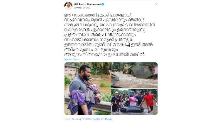 യു.എ.ഇയുടെ വിജയത്തിന് കേരള ജനത എക്കാലവും ഉണ്ടായിരുന്നെന്നും അവരെ സഹായിക്കേണ്ടത് നമ്മുടെ ഉത്തരവാദിത്വമാെണന്നും ആഹ്വാനം ചെയ്ത് ശൈഖ് മുഹമ്മദ് കുറിച്ച വാക്കുകൾ ഏറ്റെടുത്ത് കേരളത്തിലേക്കൊഴുകിയ സഹായത്തിന് കൈയും കണക്കുമില്ല. കഴിഞ്ഞ രണ്ട് വർഷങ്ങളിലായി കേരളം അഭിമുഖീകരിച്ച മഹാപ്രളയങ്ങളിൽ അവർക്ക് കൈത്താങ്ങായി നിന്നവരാണ് പ്രവാസലോകവും ഇവിടെയുള്ള ഭരണാധികാരികളും. ഞൊടിയിടയിലായിരുന്നു യു.എ.ഇയുടെ നീക്കങ്ങളത്രയും. യു.എ.ഇ പ്രസിഡൻറ് ശൈഖ് ഖലീഫ ബിൻ സായിദ് ആൽ നെഹ്യാൻ കേരളത്തെ സഹായിക്കാൻ ഉന്നത സമിതിക്ക് രൂപം നൽകാൻ നിർദേശം നൽകി. എമിറേറ്റ്സ് റെഡ് ക്രസൻറിൻെറ നേതൃത്വത്തിൽ യു.എ.ഇയിലെ ജീവകാരുണ്യ സംഘടനകളുടെ പ്രതിനിധികളെ ഉൾപെടുത്തിയായിരുന്നു സമിതിയുണ്ടാക്കിയത്. പ്രളയത്തിൻെറ പ്രത്യാഘാതം പരമാവധി കുറക്കാൻ ഇന്ത്യൻ സർക്കാറിനെ നേരിട്ട് പിന്തുണക്കണമെന്നായിരുന്നു നേതാക്കളുടെ ആഹ്വാനം. അബൂദബി കിരീടാവകാശിയും യു.എ.ഇ സായുധ സേനയുടെ ഡെപ്യൂട്ടി സുപ്രീം കമാൻഡറുമായ ശൈഖ് മുഹമ്മദ് ബിൻ സായിദ് ആൽ നഹ്യാൻ സ്ഥിതിവിവരങ്ങൾ നേരിട്ടന്വേഷിച്ചുകൊണ്ടിരുന്നു.