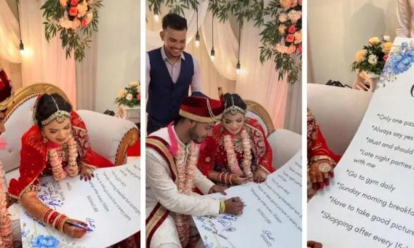text_fieldsവിവാഹം എന്നത് രണ്ട് വ്യക്തികൾ തമ്മിലുള്ള ഉടമ്പടിയാണെന്നാണ് സങ്കൽപ്പം. അങ്ങിനെ പഴമക്കാർ പറഞ്ഞ് ശീലിച്ചതാണെങ്കിലും വ്യക്തമായ നിബന്ധനകളുള്ള ഉടമ്പടിയൊന്നും ഒരു ദമ്പതികളും കണ്ടിട്ടുണ്ടാകില്ല. പങ്കാളികളെക്കുറിച്ച് മിക്ക ആളുകൾക്കും ഓരോ സങ്കൽപ്പങ്ങളുണ്ടാകും. വിവാഹ ശേഷമാകും അത് പരസ്പരം പങ്കുവയ്ക്കുക. ഇതിനെല്ലാം വിപരീദമായി വിവാഹത്തിനുമുമ്പുതന്നെ പരസ്പരം ചർച്ചചെയ്ത് ഒരു ഗംഭീര വിവാഹ ഉടമ്പടി എഴുതിയുണ്ടാക്കിയിരിക്കുകയാണ് ദമ്പതികൾ. കരാർ വലിയ വർണ്ണപേപ്പറിൽ എഴുതി വിവാഹ ദിവസം ഇരുവരും ഒപ്പുവയ്ക്കുകയും ചെയ്തു. ഇൗ വിഡിയോ സമൂഹമാധ്യമങ്ങളിൽ എത്തിയതോടെ വൈറലായി.