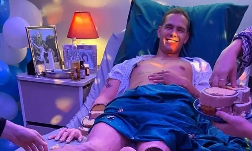 ആശുപത്രി കിടക്കയിൽ യുവാവിനെ 'വെട്ടിമുറിച്ച്' ആഘോഷം; വൈറലായി കേക്ക് മനുഷ്യൻ