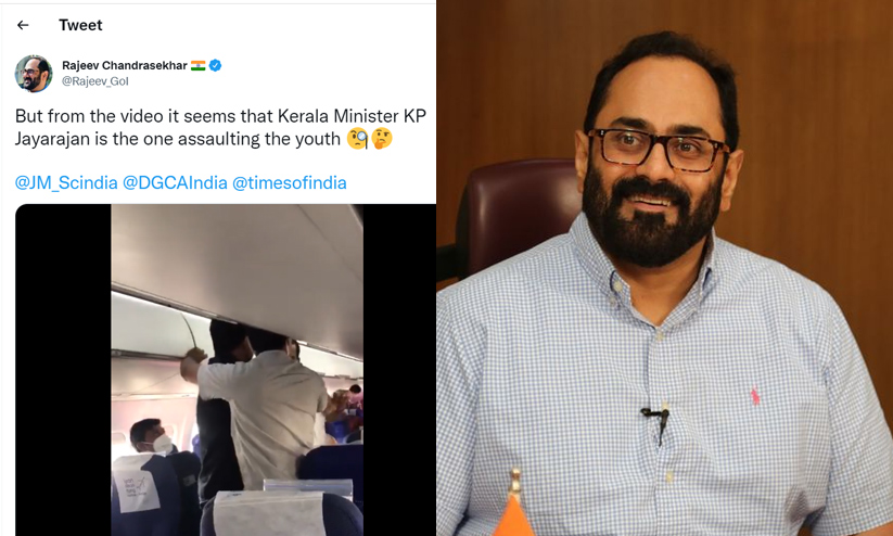 വിമാനത്തിലെ പ്രതിഷേധക്കാരെ ഇ.പി. ജയരാജൻ തള്ളിവീഴ്ത്തുന്ന വിഡിയോയാണ് രാജീവ് ചന്ദ്രശേഖർ പങ്കുവെച്ചത്. 'കേരള മന്ത്രി കെ.പി. ജയരാജൻ യുവാക്കളെ കയ്യേറ്റം ചെയ്യുന്നതായാണ് വിഡിയോയിൽ കാണുന്നത്' എന്ന് അടിക്കുറിപ്പും നൽകി. വ്യോമയാന മന്ത്രി ജ്യോതിരാദിത്യ സിന്ധ്യ, ഡയറക്ടർ ജനറൽ ഓഫ് സിവിൽ ഏവിയേഷൻ, ടൈംസ് ഓഫ് ഇന്ത്യ എന്നിവരെ ടാഗ് ചെയ്തായിരുന്നു ട്വീറ്റ്.