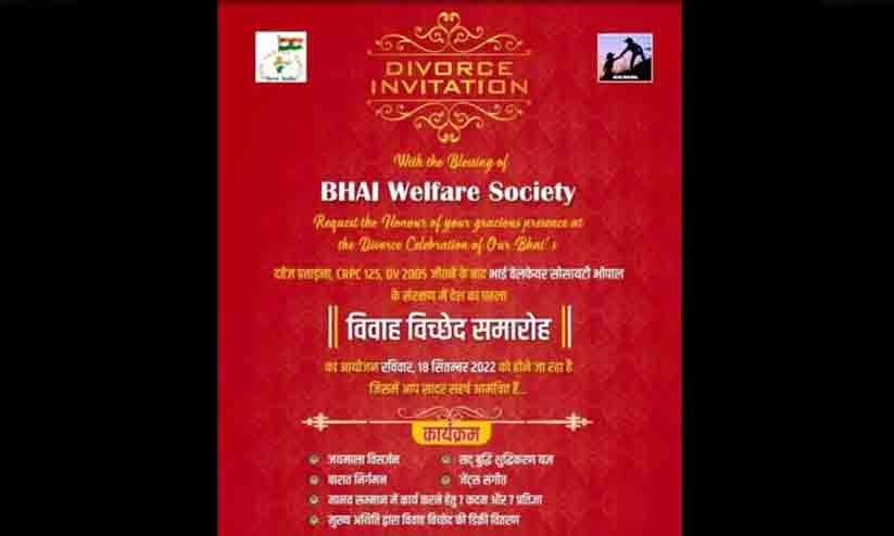 text_fieldsഭോപ്പാൽ: കണ്ടാൽ അസ്സൽ കല്യാണക്കത്തിന്റെ ലുക്ക്. വായിച്ചുനോക്കുമ്പോഴാണ് അന്തം വിടുക; വിവാഹത്തിനല്ല, 'വിവാഹ മോചന ആഘോഷ'ത്തിനാണ് ഈ ക്ഷണക്കത്തെന്ന്. ഭോപ്പാൽ ആസ്ഥാനമായുള്ള സന്നദ്ധ സംഘടനയായ (എൻ.ജി.ഒ) ഭായ് വെൽഫെയർ സൊസൈറ്റിയാണ് ചടങ്ങിന്റെ സംഘാടകർ. സ്ത്രീപീഡനം പോലെ ലോകത്ത് പുരുഷപീഡനവും ഉണ്ടെന്നും അതിന് ഇരയാകുന്നവരുടെ നിയമ പോരാട്ടങ്ങൾക്ക് വേണ്ടിയാണ് തങ്ങൾ പ്രവൃത്തിക്കുന്നതെന്നും സൊസൈറ്റി ഭാരവാഹികൾ പറയുന്നു. സേവ് ഇന്ത്യൻ ഫാമിലി എന്ന സംഘടനയുമായി സഹകരിച്ചാണ് പരിപാടി.