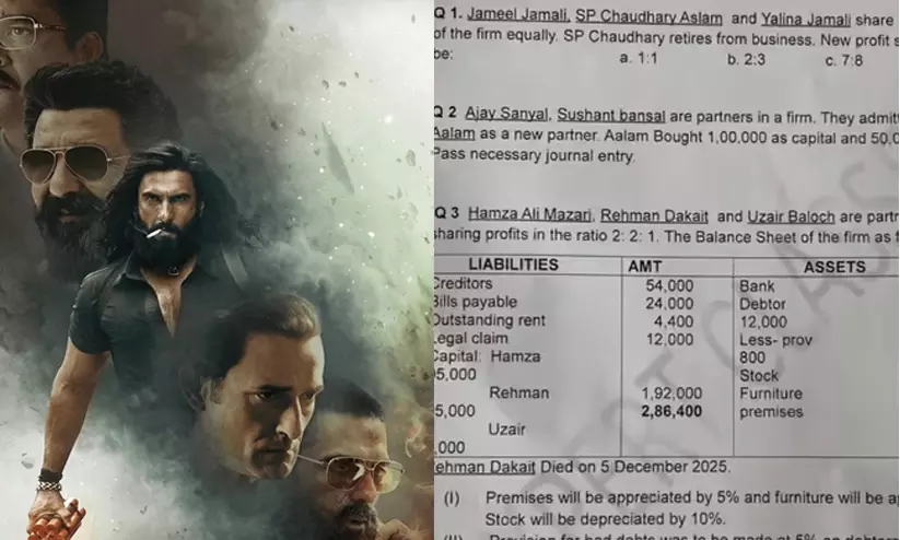 പരീക്ഷാ ഹാളിലും 'ധുരന്ധർ' ഷോ! അക്കൗണ്ട്സ് പേപ്പറിൽ റഹ്മാൻ ഡാകൈറ്റും എസ്.പി ചൗധരി അസ്ലമും; ചോദ്യം കണ്ട് കണ്ണുതള്ളി വിദ്യാർഥികൾ
