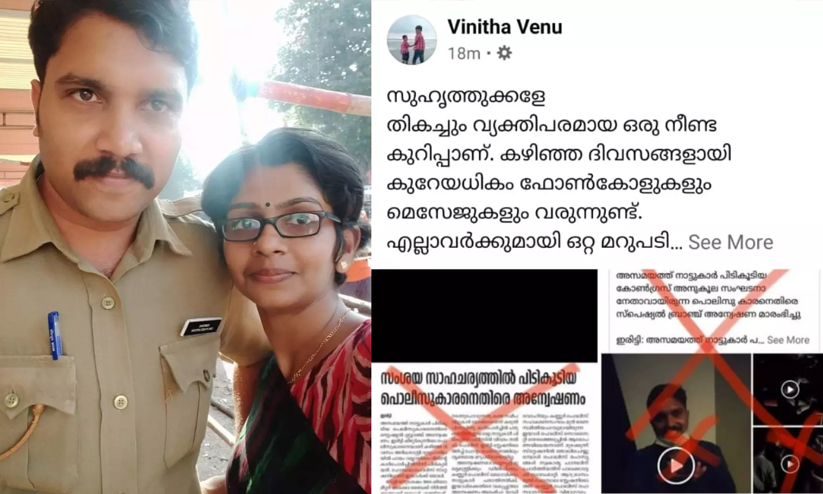 അഞ്ച് വർഷം പൊലീസ് കമ്മ്യൂണിറ്റിയിൽ ജീവിച്ചവരാണ് ഞങ്ങൾ. ഏആർ ക്യാന്പിലെ പൊലീസ് ക്വാട്ടേഴ്സിൽ .നൂറോളം കുടുംബങ്ങൾക്കിടയിൽ. ഒരാളെയും ബുദ്ധമുട്ടിക്കുന്ന ഒരു കാര്യവും ചെയ്തിട്ടില്ല. ഒരു വാക്കു കൊണ്ടോ നോക്കു കൊണ്ടോ പോലും. അക്കാര്യത്തിൽ ആർക്കെങ്കിലും പരാതി ഉണ്ടെന്നും തോന്നുന്നില്ല. ജോലിക്കിടയിലും വ്യക്തി ജീവിതത്തിലും അത്രയും മാന്യത പുലർത്തുന്നയാളാണ് എന്റെ ഭർത്താവ്. സംഘടനാ പ്രവർത്തനം നടത്തി എന്നതിന്റെ പേരിൽ മാത്രം ഒരാളെ അപമാനിക്കുകയും മോശക്കാരനായി ചിത്രീകരിക്കുകയും മാനസികമായി പീഡിപ്പിക്കുകയും ചെയ്യുകയാണ്. അതാണ് വേദനിപ്പിക്കുന്നത്.