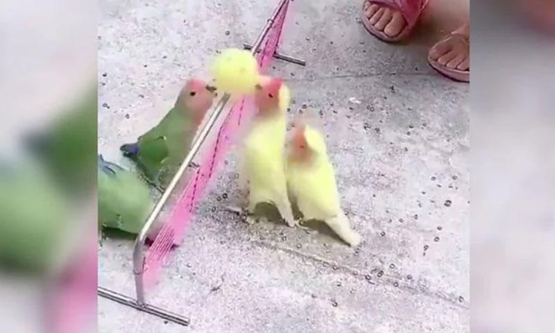 മഞ്ഞ നിറമുള്ള കിളികൾ ഒരു ടീമിലും പച്ച നിറമുള്ളവ മറ്റൊരു ടീമിലും. ആവേശത്തോടെ രണ്ടുകൂട്ടരും ബാൾ വലക്ക് അപ്പുറത്തേക്ക് ചുണ്ടുകെണ്ട് ഇട്ടുനൽകുന്നത് വിഡിയോയിൽ കാണാം. ചെറുകിളികൾക്കായി ചെറിയൊരു വോളിബാൾ കോർട്ടും ഒരുക്കി നൽകിയിട്ടുണ്ട്.