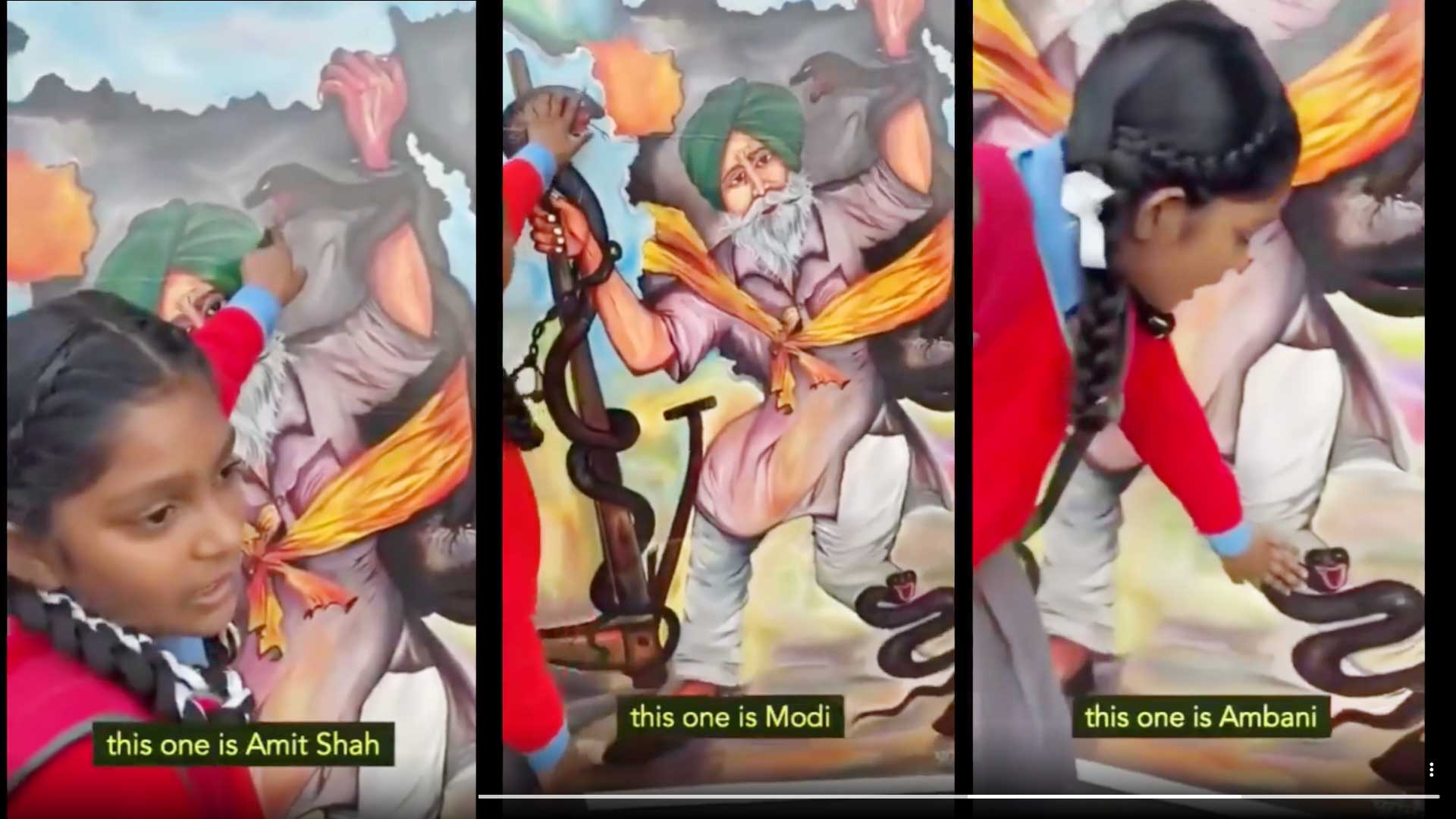 'അതെെൻറ അച്ഛൻ വരച്ച ചിത്രമാണ്. ഞാൻ നിങ്ങൾക്ക് കാണിച്ചുതരാം. ഇതിൽ മൂന്ന് പാമ്പുകളുണ്ട്. ഇൗ കലപ്പയെ ചുറ്റിവരിഞ്ഞ് നിൽക്കുന്ന പാമ്പാണ് മോദി. അതിനാൽ കർഷകന് അത് ഉപയോഗിക്കാൻ സാധിക്കുന്നില്ല. (വലതുകൈയ്യിൽ ചുറ്റിവരിഞ്ഞ് നിൽക്കുന്ന പാമ്പിനെ ചൂണ്ടിക്കൊണ്ട്) -ഇത് അമിത് ഷാ, സിഖുകാരെ മതിക്കാത്ത വ്യക്തി. ആരും ഭക്ഷണം കഴിക്കേണ്ട എന്ന നിലപാടിലാണ് അദ്ദേഹം. കർഷകെൻറ കാലിനെ അള്ളിപ്പിടിച്ചിരിക്കുന്ന മൂന്നാമത്തെ പാമ്പാണ് അംബാനി. നോക്കൂ.. കർഷകൻ അതിനെയെല്ലാം മറികടന്ന് ഉറച്ചു നിൽക്കുകയാണ്.