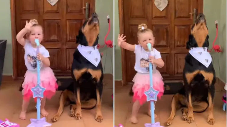 സമൂഹ മാധ്യമങ്ങളിൽ വൈറലായി വളർത്തുനായോടൊപ്പം പാട്ടുപാടുന്ന കൊച്ചു പെൺക്കുട്ടിയുടെ വിഡിയോ. മൈക്ക് പിടിച്ച് പെൺകുട്ടി പാട്ട് പാടുന്നതും അതിനനസുരിച്ച് ശബ്ദമുണ്ടാക്കുന്ന വളർത്തുനായുമാണ് വിഡിയോയിൽ.