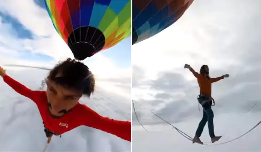 രണ്ട് എയർ ബലൂണുകൾക്ക് കുറുകെ കയറുകെട്ടി നടന്നാൽ എങ്ങനെയിരിക്കും? അത്ര ധൈര്യമുള്ള ആരെങ്കിലും ഉണ്ടാകുമോ എന്ന ചോദ്യത്തിന് മറുപടിയുമായി എത്തിയിരിക്കുകയാണ് ബ്രസീലിയൻ സ്വദേശിയായ റഫേൽ സുഗ്നോ ബേർഡി. 1901 മീറ്റർ ഉയരത്തിൽ രണ്ട് ഹോട്ട് എയർ ബലൂണുകൾക്ക് കുറുകെ കയർ കെട്ടിയാണ് കക്ഷിയുടെ സാഹസിക നടത്തം. ഈ അതിസാഹസിക നടത്തത്തിന് ഗിന്നസ് റെക്കോർഡും റഫേൽ സ്വന്തമാക്കി.