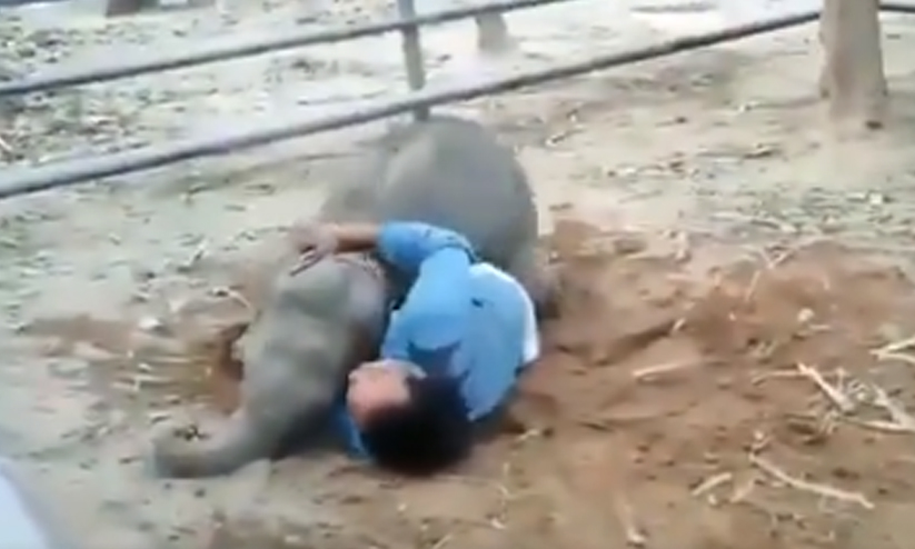 അദ്ദേഹത്തിന് ചുറ്റും നടന്ന് തള്ളുകയും തൊട്ടുതൊട്ട് നടക്കുകയും ചെയ്യുന്നു. ജോലിയിൽ ശ്രദ്ധിക്കാൻ ശ്രമിക്കുന്ന പരിപാലകനെ അതിന് സമ്മതിക്കാതെ കുട്ടിയാന വികൃതി തുടരുകയാണ്. ഒടുവിൽ അദ്ദേഹത്തെ നിലത്ത് വീഴ്ത്തുന്നതിൽ വിജയിക്കുന്ന കുട്ടിയാന പിന്നെ എഴുന്നേൽക്കാനെ സമ്മതിക്കുന്നില്ല. ശരീരത്തിലൂടെ മറിഞ്ഞും മറ്റും വികൃതി തുടരുകയാണ് കുട്ടിക്കുറുമ്പൻ.