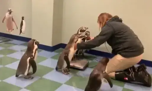 മിസോറിയിലെ സെൻ്റ് ലൂയിസ് മൃഗശാലയിൽ നിന്നുള്ള പെൻഗ്വിനുകളുടെ വിഡിയോ ആണ് ഇപ്പോൾ സോഷ്യൽ മീഡിയയിൽ ട്രെൻഡിങ്. ഭാരം നോക്കാനായി ത്രാസിനടുത്തേക്ക് പെൻഗ്വിനുകൾ വരിയായി വരുന്ന 40 സെക്കൻ്റ് മാത്രം ദൈർഘ്യമുള്ളതാണ് വിഡിയോ.