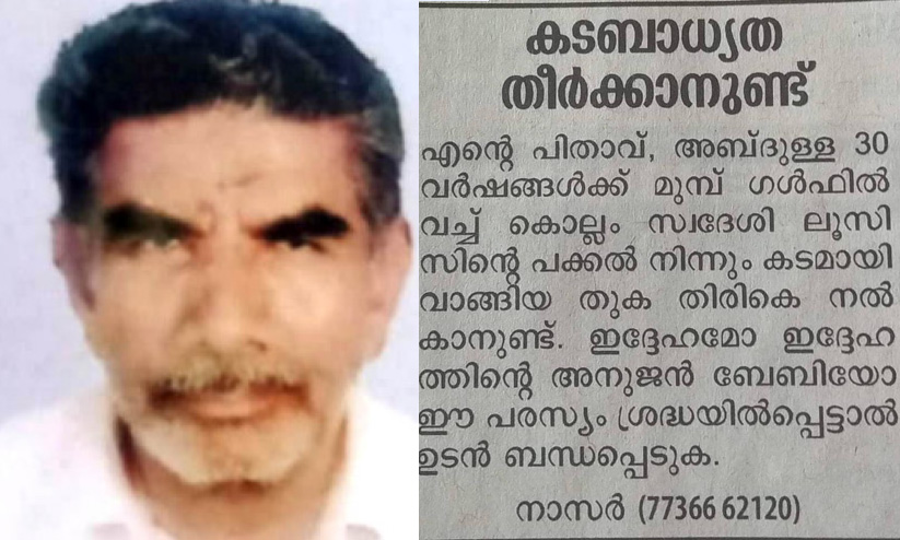 പെരുമാതുറ മാടൻവിള പുളിമൂട്ടിൽ അബ്ദുല്ലയുടെ (ഹബീബുല്ല) രണ്ടാമത്തെ മകൻ നാസറാണ് തിങ്കളാഴ്ച പത്രപരസ്യം നൽകിയത്. 'എന്റെ പിതാവ്, അബ്ദുല്ല 30 വർഷത്തിനു മുമ്പ് ഗൾഫിൽവെച്ച് കൊല്ലം സ്വദേശി ലൂസിസിന്റെ പക്കൽനിന്ന് കടമായി വാങ്ങിയ തുക തിരികെ നൽകാനുണ്ട്. അദ്ദേഹമോ അനുജൻ ബേബിയോ ഈ പരസ്യം ശ്രദ്ധയിൽപെട്ടാൽ ഉടൻ ബന്ധപ്പെടുക...' എന്നായിരുന്നു വാചകം.