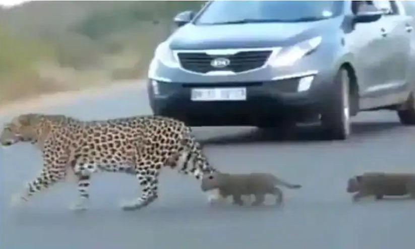 വിദേശത്തെ ഏതോ വന്യജീവി സംരക്ഷണ കേന്ദ്രത്തിൽ നിന്ന് വിനോദസഞ്ചാരികളിലാരോ പകർത്തിയ ദൃശ്യമാണിത്. നിർത്തിയിട്ടിരിക്കുന്ന കാറുകളെ ഗൗനിക്കാതെ അമ്മപ്പുലി കുഞ്ഞുങ്ങളെയും കൊണ്ട് റോഡ് മുറിച്ചുകടക്കുകയാണ്. അമ്മ മറുവശം എത്തിയിട്ടും കുഞ്ഞുങ്ങളിലൊന്ന് റോഡിൽ തന്നെ നിൽക്കുന്നു. അമ്മ തിരികെയെത്തി ആ കുഞ്ഞിനെയും കൂട്ടിപ്പോകുന്നതും വിഡിയോയിൽ കാണാം. കുട്ടികളുടെ കുസൃതിയും അമ്മയുടെ കരുതലും ദൃശ്യം അനുഭവപ്പെടുത്തുന്നു.