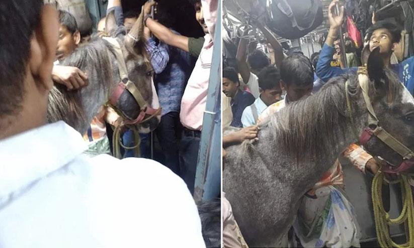കഴിഞ്ഞ ദിവസം പശ്ചിമ ബംഗാളിലെ സീൽദ-ഡയ്മണ്ട് ഹാർബർ ഡൗൺ ലോക്കൽ ട്രെയ്നിലെ കമ്പാർട്ട്മെന്റിലേക്ക് കയറിയ ആളെ കണ്ട് യാത്രക്കാർ ഒന്ന് ഞെട്ടി. പിന്നെ ആ ഞെട്ടൽ കൗതുകമായി. ഒരു കുതിരയായിരുന്നു അവരുടെ സഹയാത്രികൻ.