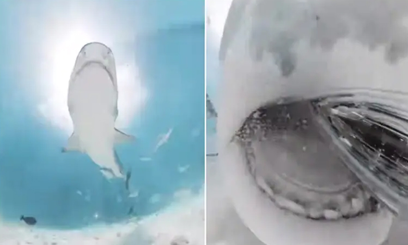 സിമി ഡാ കിഡ് എന്ന ഇൻസ്റ്റഗ്രാം പ്രൊഫൈലിലൂടെയാണ് കൗതുകകരമായ ഈ വീഡിയോ പങ്കുവച്ചിരിക്കുന്നത്. കാമറക്കരികിലൂടെ നീന്തുകയായിരുന്ന സ്രാവ് പെട്ടെന്ന് കാമറ വായിലാക്കുന്നതും അത് വിഴുങ്ങാൻ ശ്രമിക്കുന്നതും ദൃശ്യങ്ങളിൽ കാണാം.