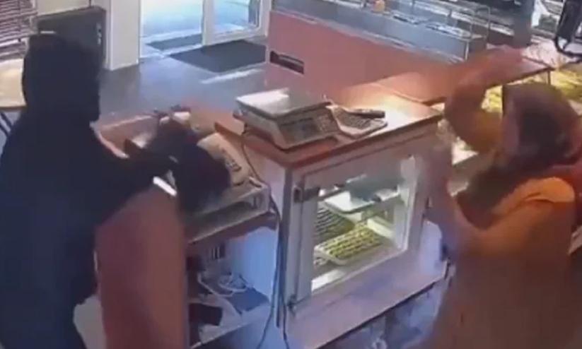 ബേക്കറിയിൽ കവർച്ചക്കെത്തിയയാളെ വൃത്തിയാക്കുന്ന തുണികൊണ്ട് നേരിട്ട് സ്ത്രീ -വൈറലായി വിഡിയോ