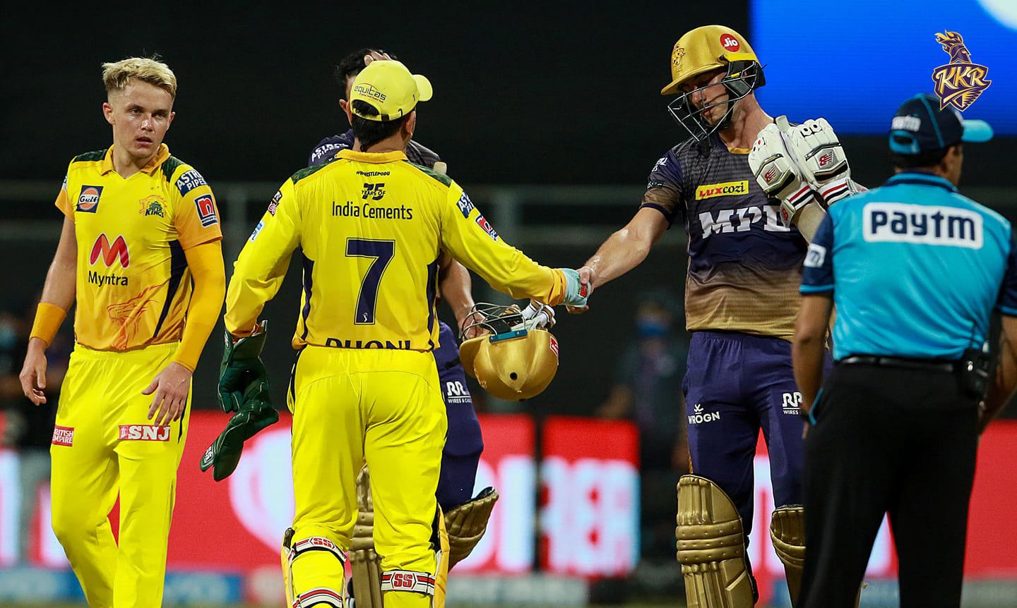 നേരത്തെ, ഫാഫ് ഡുെപ്ലസിസ് (60 പന്തിൽ 95 നോട്ടൗട്ട്) നയിച്ച റൺവേട്ടയിൽ ഋതുരാജ് ഗെയ്ക്വാദ് (42 പന്തിൽ 64) തീപ്പൊരി കോരിയിട്ട് ഒപ്പം കൂടി. ചെന്നൈയുടെ ഇന്നിങ്സിൽ കൊൽക്കത്തയുടെ ബൗളർമാർ വെറും തല്ലുകൊള്ളികളായി മാറി. മൂന്ന് വിക്കറ്റ് നഷ്ടത്തിലായിരുന്നു ചെന്നൈയുടെ 220 റൺസെന്ന കൂറ്റൻ ടോട്ടൽ. ഗെയ്ക്വാദിന് പുറമെ, മുഈൻ അലി (12 പന്തിൽ 25), എം.എസ്. ധോണി (8 പന്തിൽ 17) എന്നിവരുടെ വിക്കറ്റുകളാണ് ചെന്നൈക്ക് നഷ്ടമായത്. രവീന്ദ്ര ജദേജ ആറ് റൺസുമായി പുറത്താവാതെ നിന്നു. പാറ്റ് കമ്മിൻസ് 0/58, പ്രസിദ്ധ് കൃഷ്ണ (0/49), സുനിൽ നരെയ്ൻ (1/34) എന്നീ കൊൽക്കത്ത ബൗളർമാർക്ക് കാര്യമായിതന്നെ പ്രഹരമേറ്റു.