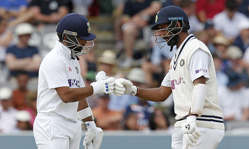 രണ്ട് റൺസുമായി ഋഷഭ് പന്തും രവീന്ദ്ര ജദേജയുമാണ് (0) ക്രീസിൽ. ഇന്ത്യക്ക് ഇതോടെ 140 റൺസിെൻറ ലീഡായി. മൂന്നു മുൻനിര താരങ്ങൾ പെട്ടെന്ന് മടങ്ങി തകർച്ച മണത്ത ഘട്ടത്തിലാണ് ഇംഗ്ലീഷ് ബൗളുകളെ ക്ഷമകൊണ്ട് നേരിട്ട് രാഹാനെയും (61) പുജാരയും (45) പ്രതിരോധ കോട്ട തീർത്തത്.