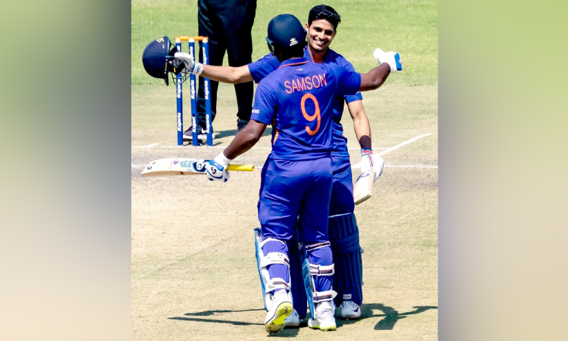 text_fieldsസെഞ്ച്വറി തികച്ച ശുഭ്മാൻ ഗില്ലിനെ സഞ്ജു സാംസൺ ആശ്ലേഷിക്കുന്നു