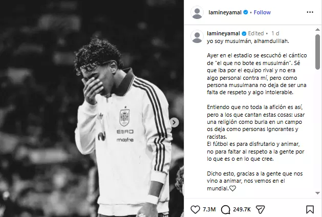 സംഭവം ഈജിപ്ഷ്യൻ ടീമിനെ ലക്ഷ്യം വെച്ചുള്ളതാണെങ്കിലും മുസ്ലിം വിശ്വാസിയായ തന്നെ ഇത് ഏറെ വേദനിപ്പിച്ചെന്ന് 18-കാരനായ യമാൽ ഇൻസ്റ്റാഗ്രാമിൽ കുറിച്ചു. 'ഞാൻ ഒരു മുസ്ലിമാണ്, അൽഹംദുലില്ലാഹ്. എതിർ ടീമിനെ ഉദ്ദേശിച്ചാണെങ്കിലും മതത്തെ പരിഹസിക്കുന്നത് തികഞ്ഞ അജ്ഞതയും വംശീയതയുമാണ്. ഫുട്ബോൾ ആസ്വദിക്കാനുള്ളതാണ്, മറ്റുള്ളവരുടെ വിശ്വാസത്തെ അധിക്ഷേപിക്കാനുള്ളതല്ല' - താരം വ്യക്തമാക്കി. മൊറോക്കോ വംശജനായ പിതാവിനും ഇക്വറ്റോറിയൽ ഗിനിയ സ്വദേശിയായ മാതാവിനും സ്പെയിനിൽ ജനിച്ച യമാൽ, നിലവിൽ ലോക ഫുട്ബോളിലെ ഏറ്റവും ശ്രദ്ധേയരായ യുവതാരങ്ങളിൽ ഒരാളാണ്.