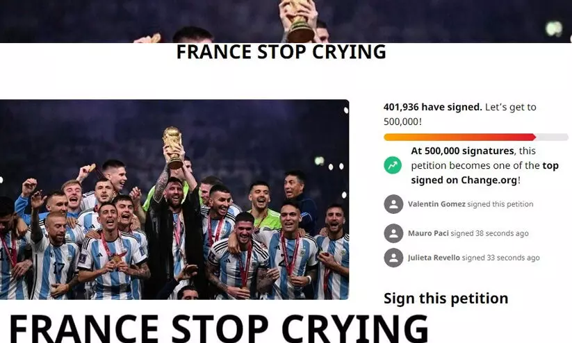 text_fieldsഖത്തർ ലോകകപ്പ് ഫൈനലിലെ തോൽവി സമ്മതിക്കാൻ ഫ്രഞ്ച് ആരാധകർ ഇനിയും തയാറായിട്ടില്ല. ഫൈനൽ വീണ്ടും നടത്തണമെന്ന ആവശ്യവുമായി ഒരു വിഭാഗം ആരാധകർ ഇന്റർനെറ്റിലൂടെ ഒപ്പുശേഖരണം നടത്തുകയാണ്.