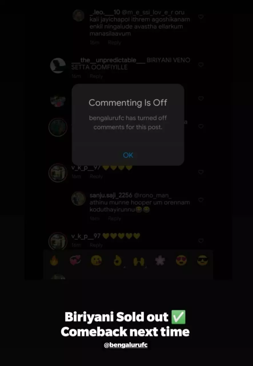 കളിയുടെ അവസാന വിസിൽ മുഴങ്ങിയതിന് പിന്നാലെ ബ്ലാസ്റ്റേഴ്സ് ആരാധകർ ബിരിയാണിച്ചെമ്പുമായി ചെന്നുകയറിയത് ബംഗളൂരു എഫ്.സിയുടെ ഇൻസ്റ്റഗ്രാം പേജിൽ. പിന്നെ തലങ്ങും വിലങ്ങും വിളമ്പലായിരുന്നു. നിമിഷനേരംകൊണ്ട് ആയിരക്കണക്കിന് 'ബിരിയാണി കമൻറു'കളാണ് ദി ബ്ലൂസിെൻറ ഒഫിഷ്യൽ പേജിലെ മാച്ച് ഫോേട്ടാക്ക് ലഭിച്ചത്. ഒടുവിൽ കമൻറ് ഒാപ്ഷൻ ഒാഫാക്കിയ ബി.എഫ്.സി അധികൃതർ 'ബിരിയാണി സോൾഡ് ഒൗട്ട്' ബോർഡ് വെച്ചു.