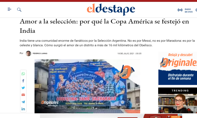 കായിക ലേഖകനായ ഫെഡറികോ ലാമാസ് സ്പാനിഷ് ഭാഷയിലാണ് ഫീച്ചർ എഴുതിയിരിക്കുന്നത്. മലപ്പുറം വാഴക്കാട്ട് സ്ഥാപിച്ച ഫ്ലക്സിെൻറ വിഡിയോയും ചീനിക്കലിൽ സ്ഥാപിച്ച അർജൻറീന ആരാധകരുടെ ബസ്സ്റ്റാൻഡും ലേഖനത്തിൽ പ്രത്യേകം പരാമർശിക്കപ്പെട്ടിട്ടുണ്ട്. അർജൻറീന ഫാൻസ് കേരളത്തിൽ ചെയ്യുന്ന സന്നദ്ധ-സേവന പ്രവർത്തനങ്ങളെയും ലേഖനം പരിചയപ്പെടുത്തുന്നു.