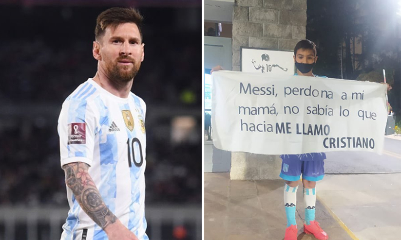 തനിക്ക് വേറൊരു ഫുട്ബാൾ സൂപ്പർ താരത്തിന്റെ പേര് നൽകാൻ തന്റെ അമ്മ തീരുമാനിച്ചതിലാണ് 11കാരനായ ആരാധകൻ മെസ്സിയോട് ക്ഷമ ചോദിച്ചത്. ടി.വൈസി സ്പോർട്സിലെ മാധ്യമപ്രവർത്തകനായ ഗാസ്റ്റൺ എഡുൽ ആണ് 11കാരന്റെ ചിത്രം സമൂഹ മാധ്യമങ്ങളിൽ പങ്കുവെച്ചത്. മറ്റാരുമല്ല മെസ്സിയുടെ മുഖ്യ എതിരാളിയായ പോർചുഗീസ് സൂപ്പർ താരം ക്രിസ്റ്റ്യാനോ റെണാൾഡോയുടെ പേരായിരുന്നു 11കാരന് സ്വന്തം അമ്മ ഇട്ടത്.