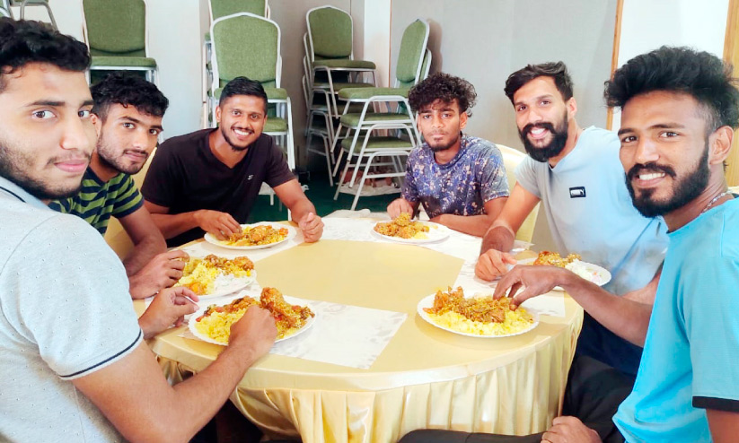 സ്വന്തം നാട്ടിലെതിനേക്കാൾ കേരള വിഭവങ്ങൾ ആസ്വദിച്ച് കഴിക്കാനാണ് ഗുജറാത്ത് താരങ്ങൾക്കിഷ്ടം. 'കേരള സൗത്ത് ഇന്ത്യൻ ഫുഡ് അച്ചാ ഹേ' -ഭക്ഷണത്തെക്കുറിച്ച് ചോദിച്ചപ്പോൾ ക്യാപ്റ്റൻ ബ്രജേഷ് കുമാർ യാദവിന്റെ മറുപടി. ഉത്തരേന്ത്യൻ ചോറും നെയ്ച്ചോറും ഫ്രൈഡ് റൈസും തേങ്ങരയച്ചതും അല്ലാത്തതുമായ ചിക്കൻ കറികളും സാമ്പാറുമെല്ലാമുണ്ട്. കഴിച്ച് കഴിഞ്ഞാൽ മധുരമായി ഹൽവയോ മറ്റോ. ടീമിലെ മലയാളി ഗോൾ കീപ്പർ എടക്കര സ്വദേശി അജ്മൽ എരഞ്ഞിക്കൽ നോമ്പെടുക്കുന്നയാളാണ്. നോമ്പ് തുറക്കാൻ കാരക്കയും ജ്യൂസും ഫ്രൂട്സും സാൻവിച്ചുമെല്ലാം ഒരുക്കും. പഞ്ചാബിന്റെ ഫിസിയോ മുഹമ്മദ് ജസീൽ, വിവിധ ടീമുകളുടെ ലൈസൻ ഓഫിസർ ഇ. റഫീഖ്, സമീർ ഖാൻ, സുൽഫിക്കർ അലി തുടങ്ങിയവരും അജ്മലിനൊപ്പം നോമ്പ് തുറക്കാനുണ്ടാവും.