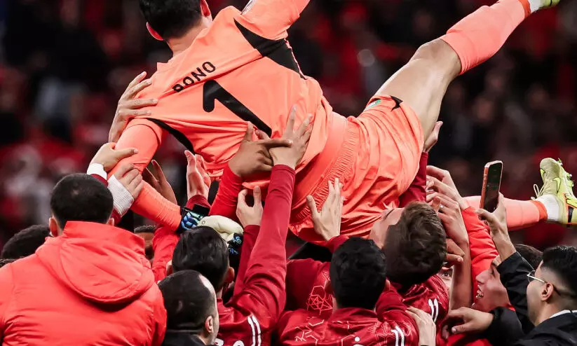 text_fieldsപെനാൽറ്റി ഷൂട്ടൗട്ടിലേക്ക് നീണ്ട ആഫ്രിക്കൻ നേഷൻസ് കപ്പ് സെമി ഫൈനലിൽ രക്ഷകനായ ഗോളി യാസീൻ ബൂനോയെ മൊറോക്കോ താരങ്ങൾ എടുത്തുയർത്തുന്നു
