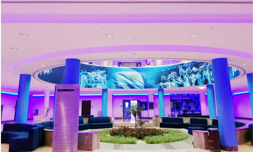 ഞായറാഴ്ച സന്നാഹ മത്സരത്തിന് അബൂദബിയിലെത്തുന്ന ലയണൽ മെസ്സിയും അർജൻറീനയും ബുധനാഴ്ച നേരിട്ട് ദോഹയിലെത്തും. ടീമിന്റെ പരിശീലനവും താമസവുമെല്ലാം ശ്രദ്ധാകേന്ദ്രമാവാൻ പോകുന്ന സർവകലാശാല കാമ്പസിനിപ്പോൾ അടിമുടി മെസ്സി മയമാണ്. ടീം അംഗങ്ങളുടെ ചിത്രങ്ങൾ പതിച്ച കവാടത്തിലെ കാഴ്ചയിലൂടെയാണ് താമസമൊരുക്കുന്ന ഹോസ്റ്റൽ ഒന്നിലേക്ക് കളിക്കാരെ വരവേൽക്കുന്നത്. തലയെടുപ്പോടെ ലയണൽ മെസ്സിയുമുണ്ട്. ചുമരുകളും താമസമുറികളും ഉൾപ്പെടെ വിവിധ കേന്ദ്രങ്ങളിലുമുണ്ട് ആകാശ നീലയും വെള്ളയും നിറങ്ങളിൽ കളിക്കാരുടെ ചിത്രങ്ങൾ.
