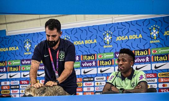 text_fieldsദക്ഷിണ കൊറിയയെ പ്രീക്വാർട്ടറിൽ അനായാസം മറിച്ചിട്ട് ക്വാർട്ടറിലെത്തിയ ബ്രസീലാണിപ്പോൾ കിരീട സാധ്യത പട്ടികയിൽ പ്രവചനക്കാരുടെ ഇഷ്ട ടീം. ആദ്യ പകുതിയിൽ അടിച്ചുകൂട്ടിയ നാലു ഗോളുകൾ ടീമിന്റെ കളിയഴകും പ്രകടനമികവും വ്യക്തമാക്കുന്നതായിരുന്നു. ക്രൊയേഷ്യയുമായി ക്വാർട്ടറിനൊരുങ്ങുന്ന ടീമിലെ മുൻനിര താരം വിനീഷ്യസ് നടത്തിയ വാർത്തസമ്മേളനത്തിന് വിരുന്നെത്തിയ പൂച്ചയാണിപ്പോൾ സമൂഹ മാധ്യമങ്ങളിൽ താരം. അൽപനേരം മാറി അരികിൽനിന്ന പൂച്ച വിനീഷ്യസിനു മുന്നിലെ മേശക്കു മുകളിൽ കയറി ഇരിപ്പുറപ്പിക്കുകയായിരുന്നു. ശാന്തതയോടെ സദസ്സ് വീക്ഷിച്ച് മേശക്കുമുകളിൽ വിശ്രമിച്ച പൂച്ചയുടെ ഇരിപ്പ് വിനീഷ്യസിന് അസ്വസ്ഥതയുണ്ടാക്കിയില്ലെങ്കിലും