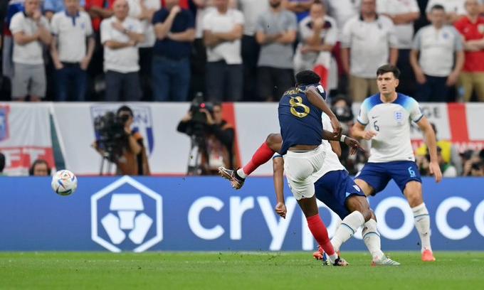 പുൽപ്പരപ്പുകളെ അതിവേഗം കൊണ്ട് തീപിടിപ്പിച്ച ആവേശപ്പോരിൽ തുടക്കത്തിലേ ലീഡ് പിടിച്ച് ഫ്രാൻസ് വരവറിയിച്ചു. കിലിയൻ എംബാപ്പെ, അന്റോണിയോ ഗ്രീസ്മാൻ എന്നിവർ ചേർന്ന് അപകടങ്ങളേറെ തീർത്ത ഇംഗ്ലീഷ് കളിമുറ്റത്ത് അത്രയേറെ ഗോൾസാധ്യത തോന്നിക്കാത്ത നിമിഷത്തിലായിരുന്നു അത് സംഭവിച്ചത്. കളിയുടെ 10ാം മിനിറ്റിൽ ബോക്സിൽ ഗ്രീസ്മാൻ പിറകിലേക്കു നൽകിയ പാസ് സ്വീകരിച്ച ഷൂമേനി ഒന്നുരണ്ട് ടച്ചിൽ വെടിച്ചില്ല് കണക്കെ അടിച്ചുകയറ്റുകയായിരുന്നു. പ്രതിരോധം കാത്ത് രണ്ടു പേർ മുന്നിൽനിൽക്കെയായിരുന്നു മനോഹരമായ ഗോൾ. നീണ്ടുചാടിയ ഗോളി പിക്ഫോഡിനും കാഴ്ചക്കാരനാകാനേയായുള്ളൂ.
