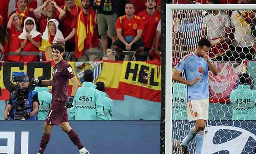 77 ശതമാനം പൊസിഷൻ, 1019 പാസുകൾ- അതിൽ 926 എണ്ണവും കിറുകൃത്യം..എന്നിട്ടും ഒരു ടീം ഇവ്വിധം പിന്നിലായിപ്പോകുന്നത് ദയനീയം തന്നെ. മൊറോക്കോയുടെ പാസുകളുടെ എണ്ണം 304 മാത്രമായിരുന്നുവെന്നോർക്കണം. പന്ത് സ്വന്തം കാലുകളിൽ കുരുക്കിയിട്ട് കളിച്ചിട്ടും ടാർഗെറ്റിലേക്ക് സ്പെയിൻ നിറയൊഴിച്ചത് ഒരേയൊരു തവണ.