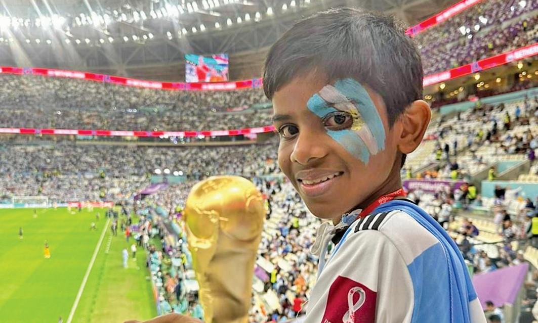 ലുസൈൽ സ്റ്റേഡിയത്തിൽ വെള്ളിയാഴ്ച നടന്ന നാടകീയമായ പോരാട്ടത്തിൽ െപനാൽറ്റി ഷൂട്ടൗട്ടും കടന്ന് ലയണൽ മെസ്സിയും സംഘവും സെമിയിലേക്ക് മാർച്ച് ചെയ്യുേമ്പാൾ ഗാലറിയിലിരുന്ന് അർജൻറീന പതാക പാറിച്ച് അവൻ തുള്ളിച്ചാടി.