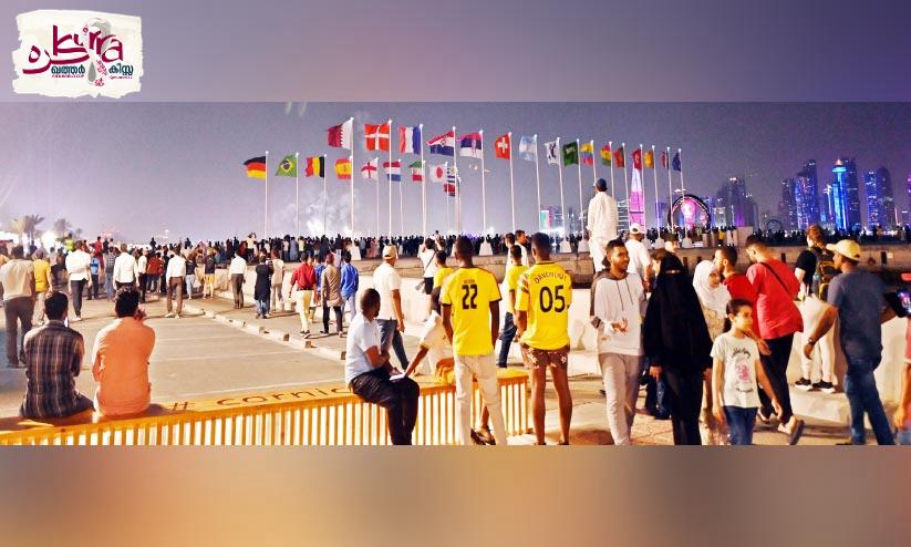 ഈ തെരുവുകളും അങ്ങാടികളുമാണ് ലോകകപ്പ് ഫുട്ബാളിന് ആവേശംപകരുന്ന നാഡീഞരമ്പുകൾ. ഈന്തപ്പനയോല മാതൃകയിലെ തെരുവുവിളക്കുകൾ പ്രഭ ചൊരിയുന്ന ദോഹ കോർണിഷ് ഇപ്പോൾ ഉറങ്ങാറില്ല. ഉച്ചവെയിലിൽപോലും ആളൊഴുകുന്ന ഇടമായി കോർണിഷിലെ കൗണ്ട് ഡൗൺ ക്ലോക്കും ഫ്ലാഗ് പ്ലാസയും മാറുന്നു.
