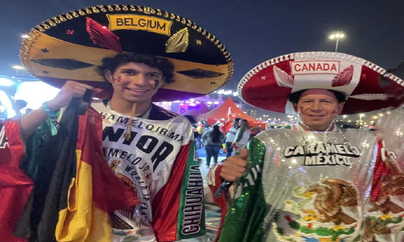 എല്ലാവരോടും പുഞ്ചിരിച്ചും ഫോട്ടോക്ക് പോസ് ചെയ്തും കറാമെലോ മെക്സികോ സോക്കർ കലണ്ടർ കാർഡും സമ്മാനിക്കുന്നു. കുപ്പായത്തിൽ മെക്സികോയും തൊപ്പിയിൽ കാനഡ, ബെൽജിയം എന്നെഴുതിയുമാണ് അച്ഛനും മകനും കഴിഞ്ഞ ദിവസത്തെ മത്സരത്തിനെത്തിയത്.