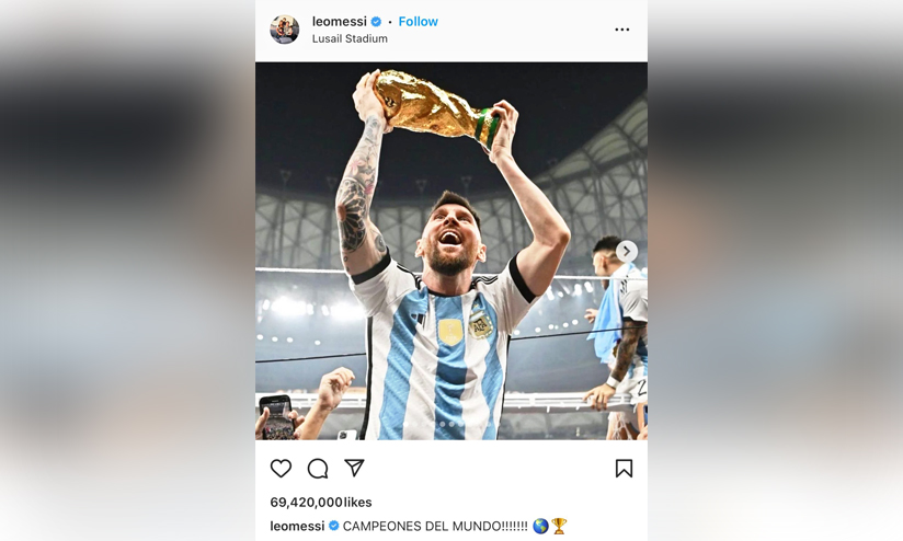 കിരീടം ചൂടിയ അർജന്റീന ക്യാപ്റ്റൻ ലയണൽ മെസ്സി ഇൻസ്റ്റഗ്രാമിൽ കപ്പുമായുള്ള ചിത്രം പോസ്റ്റ് ചെയ്തത് റെക്കോഡിട്ടിരുന്നു. ഇൻസ്റ്റഗ്രാമിന്റെ ചരിത്രത്തിൽ ഏറ്റവും കൂടുതൽ ലൈക്ക് നേടിയ പോസ്റ്റായി അത് മാറി. 6.9 കോടി ആളുകളാണ് ആ ചിത്രം രണ്ടു ദിവസത്തിനുള്ളിൽ ലൈക് ചെയ്തത്. വാട്സ്ആപിെൻെറയും ഫേസ്ബുക്കിെൻെറയും പാരൻറ് കമ്പനിയായ മെറ്റയുടെ സി.ഇ.ഒ മാർക് സക്കർബർഗ് തന്നെയാണ് ഇക്കാര്യം അറിയിച്ചത്.