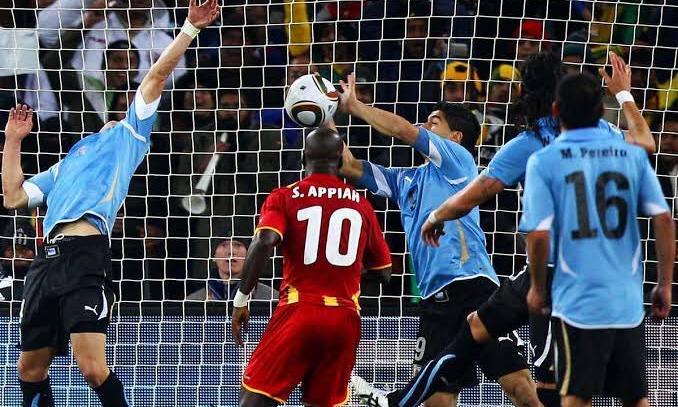 text_fields2010 ലോകകപ്പിൽ കളി അവസാന വിസിലിന് കാത്തുനിൽക്കെയായിരുന്നു അന്ന് ഘാന അർഹിച്ച ഗോൾ സുവാരസ് കൈകൊണ്ട് തടുത്തിട്ടത്. ഗോളിയെ കീഴടക്കിയ പന്ത് വലക്കണ്ണികളിലേക്ക് പറക്കുമ്പോഴായിരുന്നു ഗോൾലൈനിൽനിന്ന സുവാരസ് കൈകൊണ്ട് തട്ടി മാറ്റിയത്. സുവാരസിന് ചുവപ്പുകാർഡ് നൽകി പുറത്താക്കിയ റഫറി ഘാനക്ക് അനുകൂലമായി പെനൽറ്റി അനുവദിക്കുന്നു. കിക്കെടുത്ത ഘാന താരത്തിന്റെ ഷോട്ട് പക്ഷേ, ക്രോസ്ബാറിൽ തട്ടി പുറത്തേക്ക്. തലയിൽ കൈവെച്ചു നിന്ന ഘാന താരങ്ങൾക്കു മുന്നിൽ താരരാജാവിന്റെ പരിവേഷത്തോടെ സുവാരസും സംഘവും ക്വാർട്ടറിലേക്ക്.
