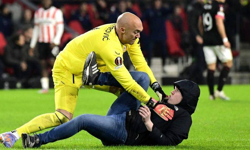 എന്നാൽ, നെതർലൻഡ്സിലെ ഫിലിപ്സ് സ്റ്റേഡിയത്തിൽ നടന്ന പി.എസ്.വി അയിൻഥോഫനും സെവിയ്യയും തമ്മിലുള്ള യൂറോപ്പ ലീഗ് പ്രീ-ക്വാർട്ടർ മത്സരം അപൂർവമായൊരു കൈയാങ്കളിക്ക് സാക്ഷിയായി. ഗ്രൗണ്ടിലേക്ക് അതിക്രമിച്ചു കടന്ന ഡച്ച് ക്ലബിന്റെ ആരാധകനും സെവിയ്യ ഗോൾ കീപ്പർ മാര്ക്കോ ദിമിത്രോവിച്ചും തമ്മിലായിരുന്നു കൈയാങ്കളി. ഒരു ബോക്സറും ഗുസ്തിക്കാരനും തമ്മിലുള്ള അസ്സലൊരു പോരാട്ടം.