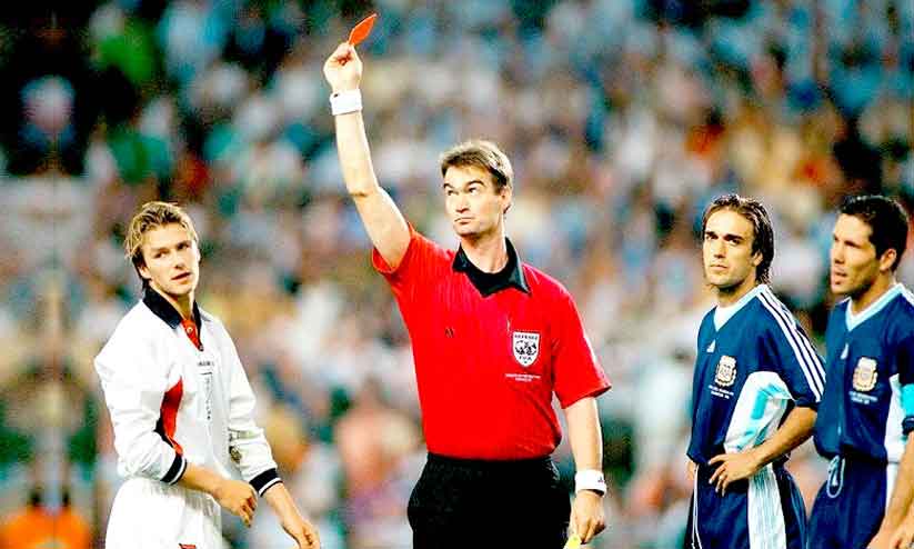 text_fields1998 ലോകകപ്പ് ക്വാർട്ടറിൽ ഇംഗ്ലണ്ടിന്റെ ഡേവിഡ് ബെക്കാം ചുവപ്പുകാർഡ് കണ്ട് പുറത്താവുന്നു
