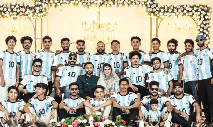 ഭക്ഷണഹാളിലും 'മെസി' മയം. ഭക്ഷണം പാസ് ചെയ്തും ഡ്രിബിൾ ചെയ്തും വിവാഹത്തിനെത്തിയവരെ സുഹൃത്തുക്കൾ സൽക്കരിച്ചു. മിനി റൊസാരിയോ തെരുവ് എന്നാണ് ഇവർ നാടിനെ വിശേഷിപ്പിക്കുന്നത്. പ്രദേശത്തെ 30ലധികം യുവാക്കളാണ് വിവാഹവേദിയെ ആകാശനീലിമയിൽ നിറച്ചത്. അർജൻറീന ആരാധികയായ വധു ഷബാനയും ടീമിനൊപ്പം പങ്കുചേർന്നു. വരനും വധുവിനും സമ്മാനമായി അർജൻറീനയുടെ ജഴ്സി കൊടുക്കാനും സുഹൃത്തുക്കൾ മറന്നില്ല. ഇതിന് പുറമെ ഈ വർഷം ഇറ്റലിയെ പരാജയപ്പെടുത്തി ഫൈനലിസിമ കിരീടം നേടിയ ടീമംഗങ്ങളുടെ ഗ്രൂപ് ഫോട്ടോയും ഫ്രെയിം ചെയ്തു നൽകി.