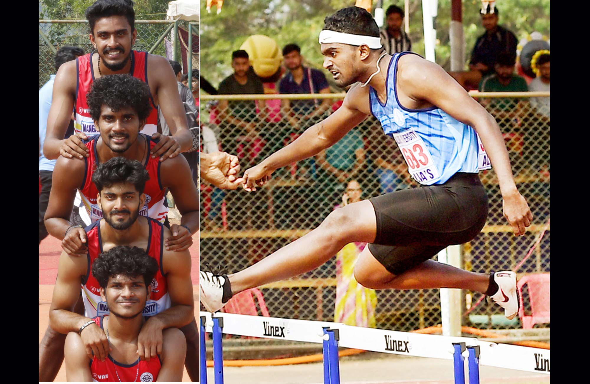 text_fields1-400 മീറ്റര് റിലേയില് മൂന്നാം സ്ഥാനം നേടിയ എം.ജി. സർവകലാശാലയിലെ (മുകളില്നിന്ന് താഴേക്ക്) ജെറിന് ജോണി, എന്.എം. മനു റോഷന്, സി.ആര്. അനിരുദ്ധ്, എസ്. അക്ഷയ്, 2- 400 മീറ്റർ ഹഡ്ൽസിൽ കാലിക്കറ്റിന്റെ എ. രോഹിത് വെള്ളി മെഡൽ നേടുന്നു - പി. സന്ദീപ്