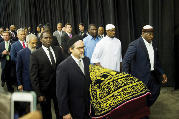 അമേരിക്കന് മുന് പ്രസിഡന്റ് ബില് ക്ളിന്റണ്, സിനിമാതാരം ബില്ലി ക്രിസ്റ്റല്, മാല്കം എക്സിന്െറ മകള് അതല്ല ശഹബാസ്, മുഹമ്മദ് അലിയുടെ ഭാര്യ ലോണി, മക്കളായ മര്യം, റശീദ എന്നിവര് അന്ത്യോപചാരമര്പ്പിച്ച് സംസാരിച്ചു.തുര്ക്കി പ്രസിഡന്റ് റജബ് ത്വയ്യിബ് ഉര്ദുഗാന്, ജോര്ഡന് രാജാവ് അബ്ദുല്ല, ഗായകന് യൂസുഫുല് ഇസ്ലാം തുടങ്ങിയ പ്രമുഖര് അന്ത്യോപചാരമര്പ്പിക്കാന് എത്തിച്ചേര്ന്നു. കുടുംബപരമായ കാരണങ്ങളാല് യു.എസ് പ്രസിഡന്റ് ബറാക് ഒബാമ ചടങ്ങിനത്തെിയില്ല.