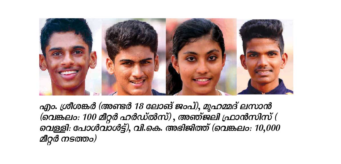 അപര്ണ റോയ് (സ്വര്ണം: അണ്ടര് 16 പെണ്, 100 മീ. ഹര്ഡ്ല്സ് മീറ്റ് റെക്കോഡ്)