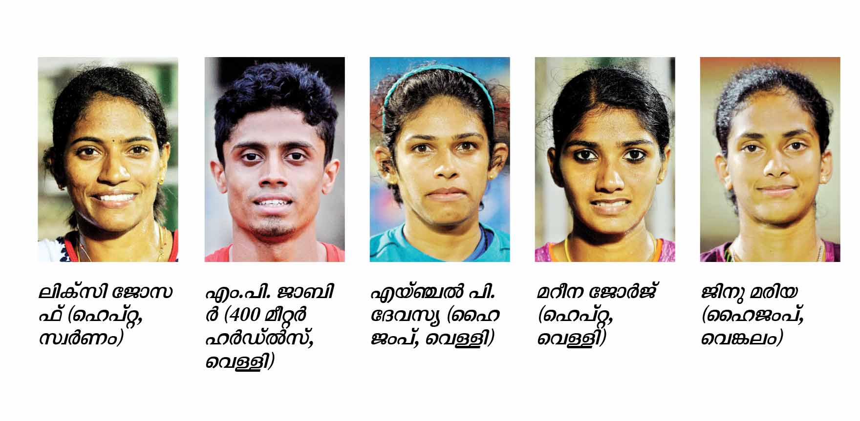 കേരളത്തിന് സ്വർണപ്രതീക്ഷയുണ്ടായിരുന്ന വനിതകളുടെ ഹൈജംപിൽ മൂവാറ്റുപുഴക്കാരി ജിനു 1.73 മീറ്റർ ചാടി മൂന്നാമതായി. 1.76 ഉയരത്തിൽ ഇടുക്കി കട്ടപ്പന സ്വദേശിനിയായ എയ്ഞ്ചൽ ഒ.എൻ.ജി.സിക്കായി വെള്ളി നേടി. റെയിൽവേസിെൻറ ജ്യോതിക്കാണ് സ്വർണം. 800 മീറ്റർ ഓട്ടം 1.54:50 സെക്കൻഡിൽ പൂർത്തിയാക്കിയാണ് അഫ്സൽ സർവിസസ് ഷെൽഫിലേക്ക് ഒരു സ്വർണംകൂടി ചേർത്തത്. ബംഗളൂരുവിൽ വ്യോമസേന ഉദ്യോഗസ്ഥനാണ് പാലക്കാട് പറളി സ്വദേശിയായ അഫ്സൽ. ഹെപ്റ്റാത്തലണിലെ സ്വർണജേത്രി റെയിൽവേസ് താരം ലിക്സി വയനാട് പുൽപള്ളിക്കാരിയാണ്. ഇടുക്കി വാഴത്തോപ്പാണ് ഹെപ്റ്റാത്തലണിൽ വെങ്കലം നേടിയ കേരള താരം മറീനയുടെ സ്വദേശം. ആറു സ്വർണം, അഞ്ചു വെള്ളി, ആറു വെങ്കലം എന്നിങ്ങനെയാണ് മീറ്റിൽ മലയാളികളുടെ ആകെ നേട്ടം.