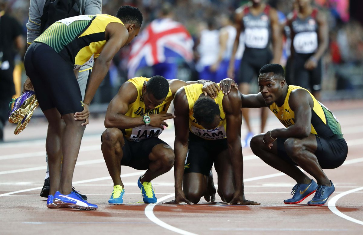 വേഗത കൊണ്ട് ലോകത്തെ വിസ്മയിപ്പിച്ച ബോൾട്ടിനെ തൻെറ കരിയറിലെ അവസാന മത്സരത്തിൽ കാത്ത് വെച്ചത് അപ്രതീക്ഷിതമായ വിടവാങ്ങലായിരുന്നു. അവസാന ലാപ്പിൽ ബോൾട്ടിന് ബാറ്റൺ ലഭിക്കുേമ്പാൾ മൂന്നാം സ്ഥാനത്തായിരുന്നു ജമൈക്ക. ബോൾട്ടിന്റെ ഇടതു ഭാഗത്ത് ബ്രിട്ടനും വലത് അമേരിക്കയും കുതിക്കുകയായിരുന്നു. ബോൾട്ടിെൻറ ഒറ്റക്കുതിപ്പിലൂടെ സ്വർണ്ണത്തിലേക്ക് ജമൈക്ക ഒാടി കയറുമെന്നാണ് എല്ലാവരും പ്രതീക്ഷിച്ചിരുന്നത്.എന്നാൽ പിന്നീട് നടന്നത് കായിക പ്രേമികൾ മറക്കാനാഗ്രഹിക്കുന്ന സംഭവങ്ങളായിരുന്നു.